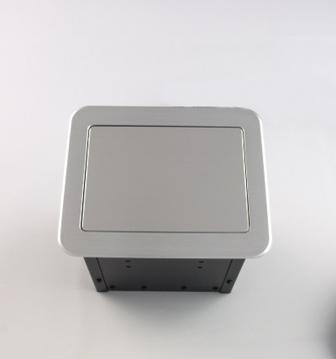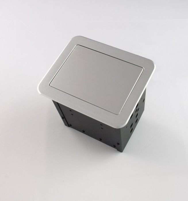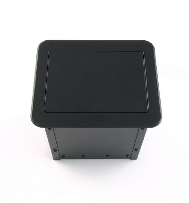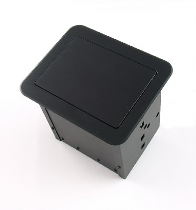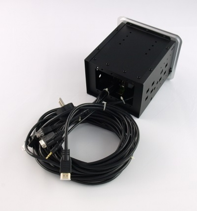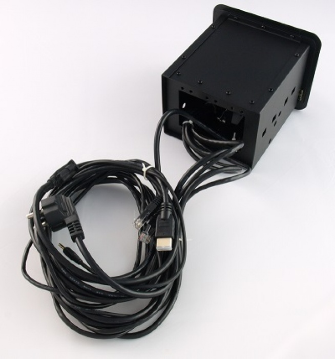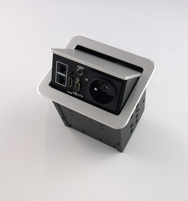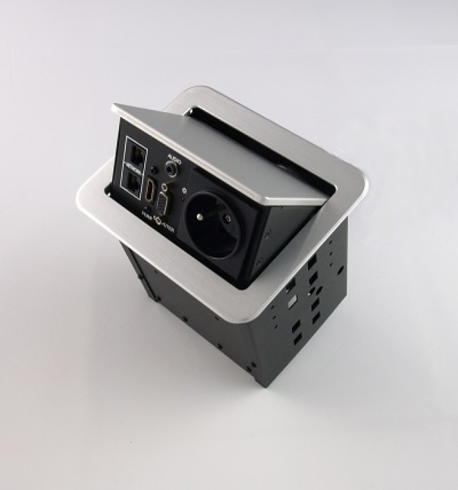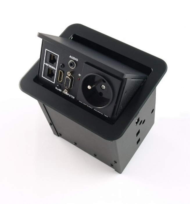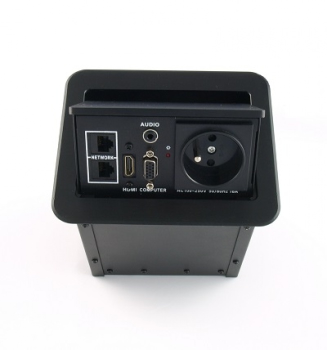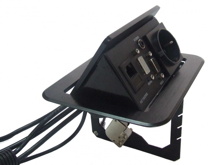 Montażowe przyłącze stołowe z wbudowanym gniazdem zasilającym, gniazdem ethernetowym, komputerowym gniazdem VGA, cyfrowym gniazdem High-Definition HDMI oraz gniazdem audio mini-jack. Pokrywa i kołnierz wykonane z aluminium. Kolor czarny. Przedni panel odchylany pneumatycznie.