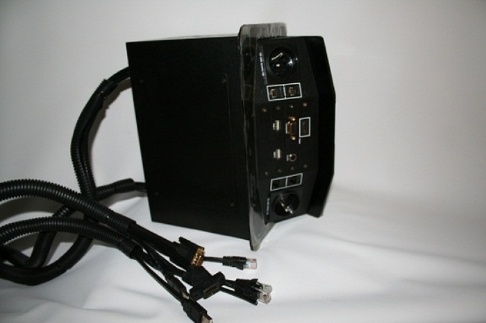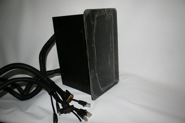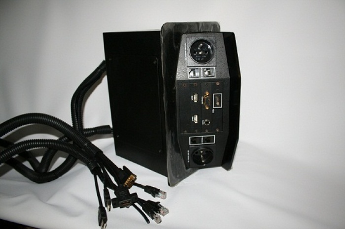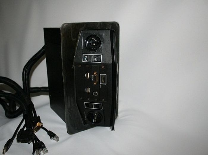Przyłącze JS-700-B wykonane jest z aluminum i przystosowane jest do montażu w blacie stołu/biurka. Przyłacze posiada następujące interfejsy: